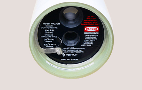 Codeline Ecoline 40L30N is membrane housing series of 4” diameter with end entry design. This is used for commercial RO application in operating pressure of 300 PSI. These are made up of epoxy/ glass composite to meet the demands of long term and continuous use. Codeline 40L30N can accommodate any standard 4” nominal diameter spiral-wound membrane element.