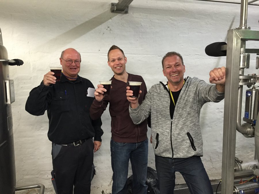 Enjoying a glass of BMF filtered beer (from left): Soren Gronberg, Carlsberg; Elmar van Mastrigt, Pentair Project Manager R&D Beverage and Oliver Meckler, Pentair Senior Area Sales Manager Beverage