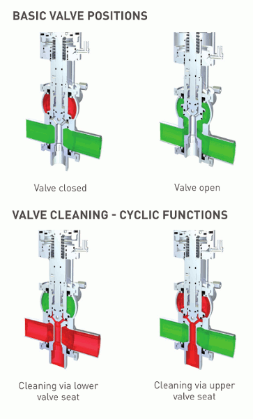 The valves work by simultaneous, programmed filling, emptying, and cleaning of production lines without contamination risk. They achieve this by reliably separating the upper and lower valve housing, allowing one or more lines or tanks (purple and red lines) to be cleaned during production (yellow and green lines).
