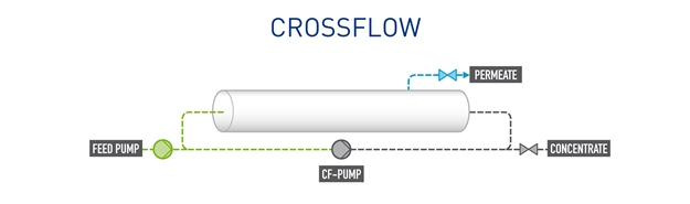 The cross-flow mode, usually applied with this type of membrane module, is a process in which the medium to be filtered (e.g. the biological sludge) is pumped through the tubes of the filter, keeping the membranes clean.
